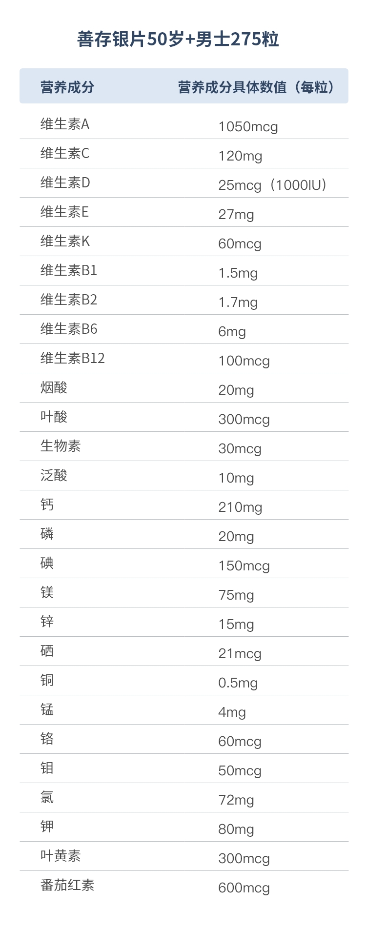 科学配比,5大维生素,8种B族营养素,13种矿物质;为年长者特殊的设计的配方除了保障日常营养素矿物质的需求,还有助于心脏、大脑、视力健康,辅助保护肌肉健康